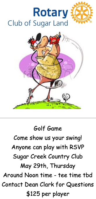 We will be playing golf at the Sugar Creek Country Club on May 29, Thursday.