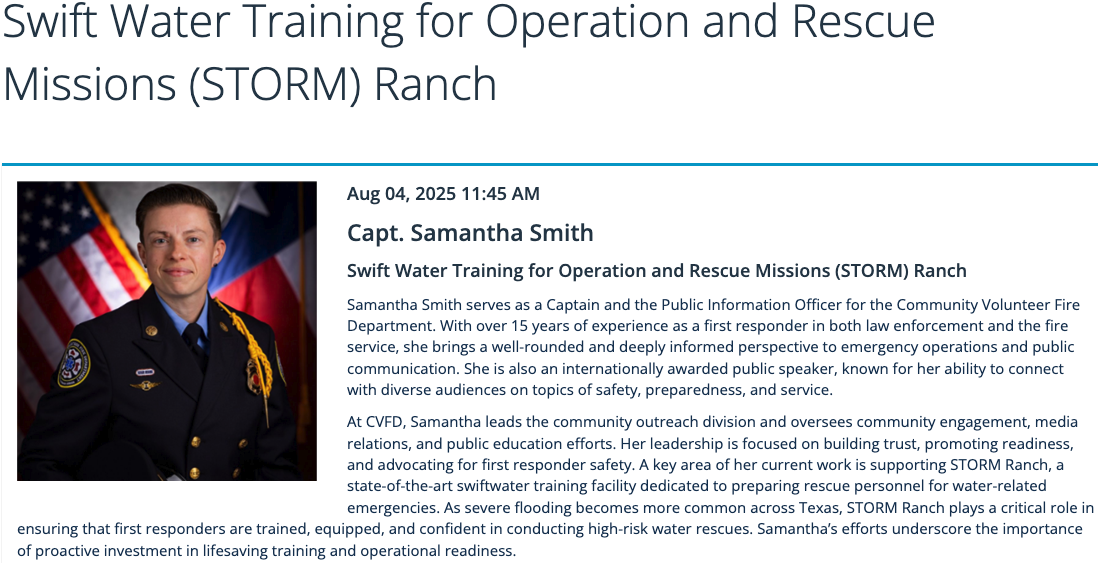 • Speaker: 15 October 2025 - STORM Ranch - Swiftwater Training Facility - Captain Samantha Smith